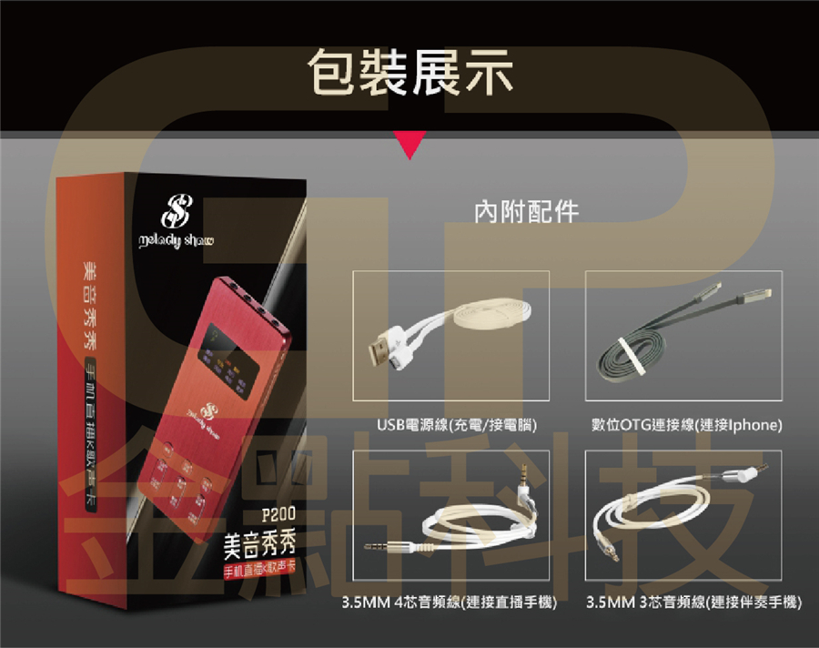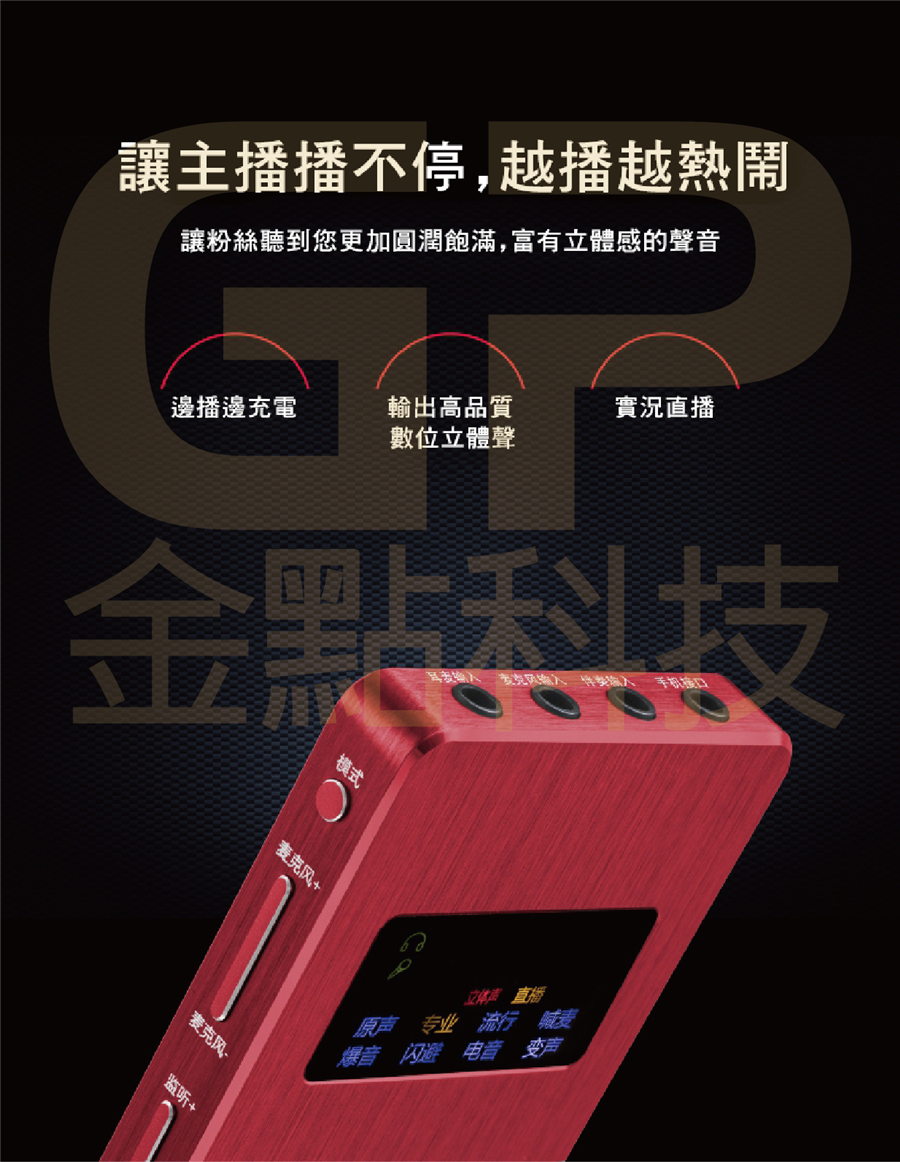 2.全金屬機身,拉絲氧化表面處理,機身厚度僅10.0MM, LED動態顯示,1600mAh大容量電池,可供手機充電,12種場控音效,輕鬆詼諧,主播可隨時掌控場面!